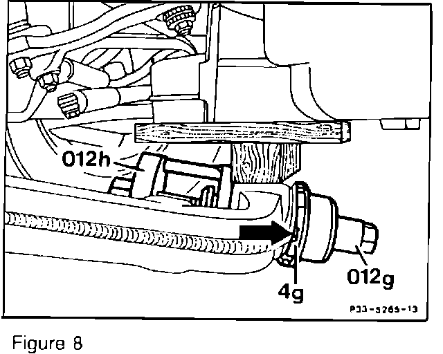 8. Using remover/installer 140 589 03 43 00 (012g, 012j, Figure 7), press the hydraulic bushing (4g) into the control arm to a point approx. 1 in. before the shoulder.