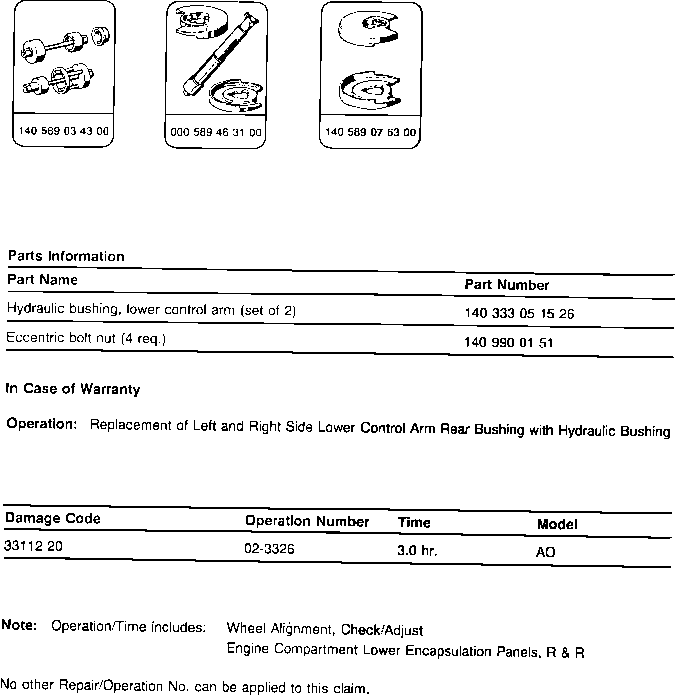 MODEL 140 REPLACEMENT OF LOWER CONTROL ARM REAR BUSHING WITH HYDRAULIC BUSHING