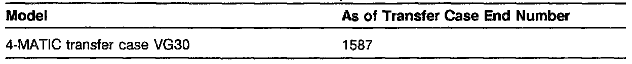 On all exchange 4-MATIC transfer cases VG3O, as of the effective serial number shown, the transmission housing sealing surface for piston AV and piston ZS radial seal ring is reworked. As a result, a modified piston AV and piston ZS radial seal ring (of different inner and outside diameter) is required.