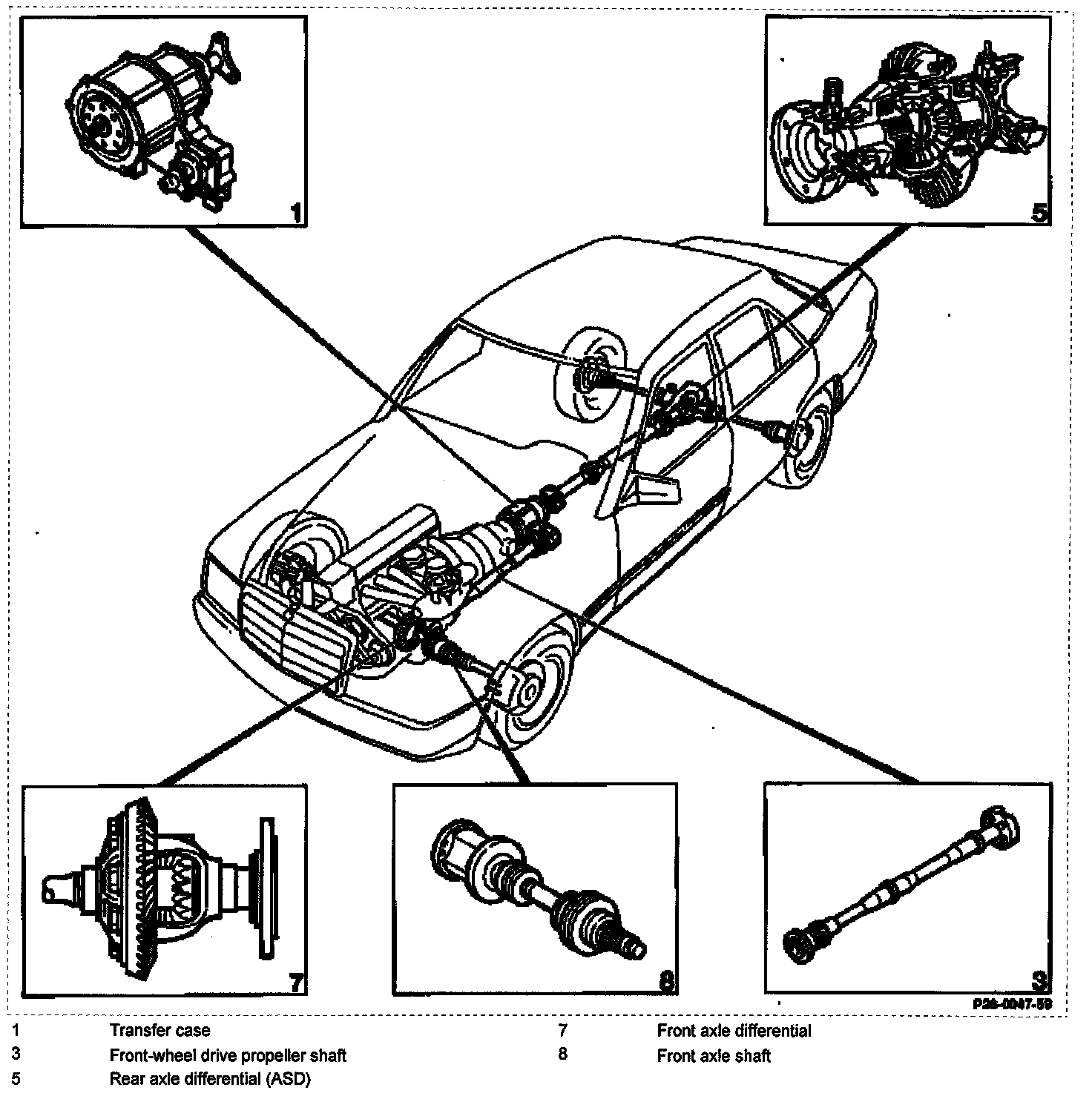 The rear axle shafts are shorter than on vehicles without ASD due to the arrangement of the ring cylinders and connecting flange.