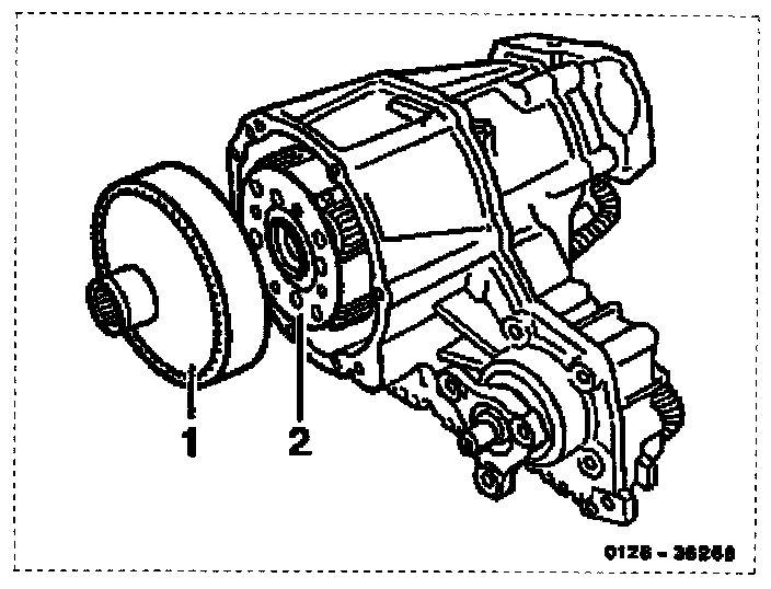 As of transfer case no.7 013 a center differential (2) with modified teeth (straight) has been installed in the transfer case. At the same time, the manual and automatic transmissions are fitted with a suitably modified internally-geared wheel (1).