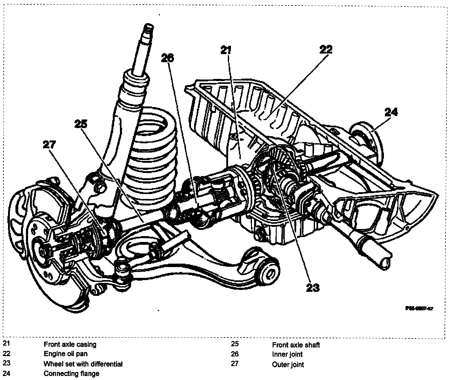 The front axle casing (21) and the engine oil pan (22) form one unit. The front axle casing contains the gear set with differential (23). The oil compartments are separated from the differential and engine. The shaft to the right connecting flange (24) leads through the engine oil pan and is partitioned off at this oil compartment by a protecting tube. The front axle shafts (25) have a different length on the left and the right. The inner joint (26) is a sliding joint (tripod joint), which compensates for axial displacements and angle changes during suspension compression. The outer joint (27) is a rigid joint (Rzeppa joint), which permits steering lock and jount changes; in addition this joint secures the front axle shaft in the axial direction. The damper strut front axle has been retained in principle. Parts of the wheel control have been revised for front-wheel drive. Two of the lower coils on the front springs are fully extended. The front axle shafts lead to the front wheels through the resultant space.