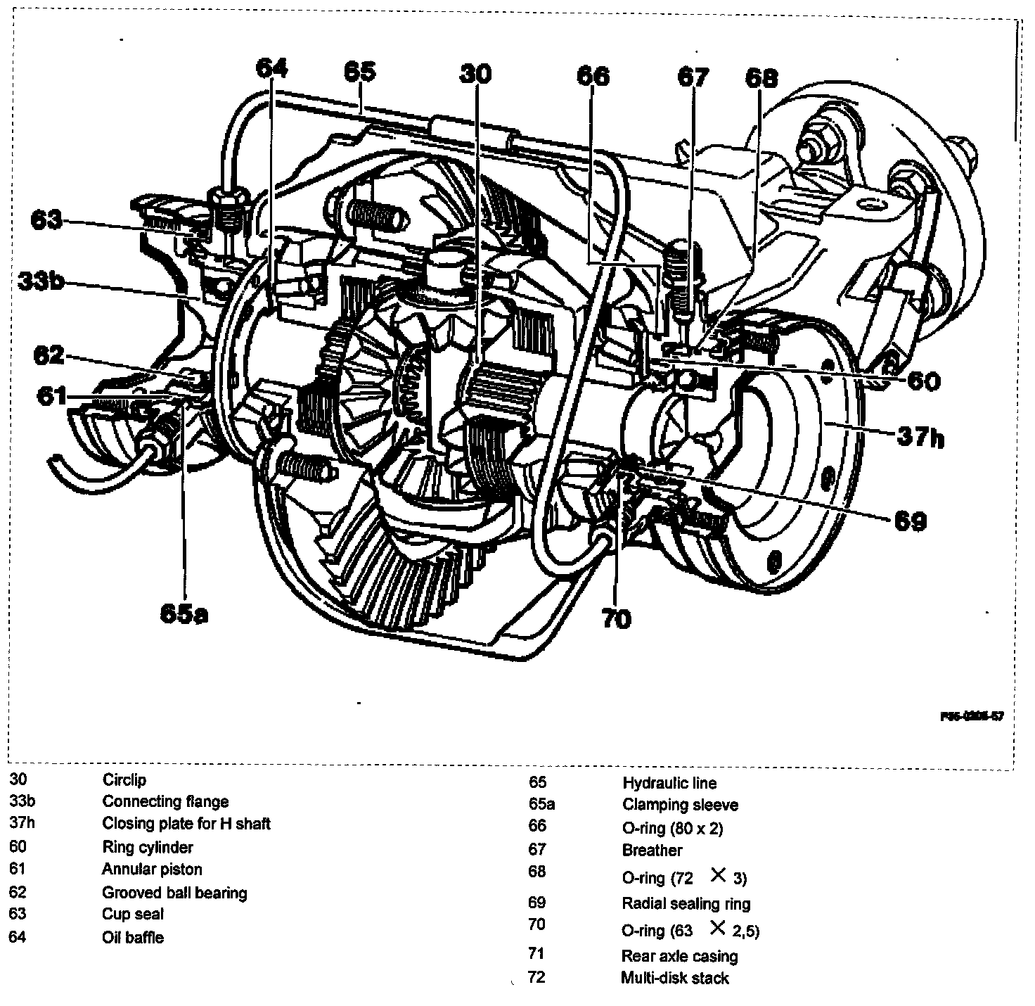 The ring cylinders (60) are secured laterally on the rear axle casing (71) with two M8 hexagon socket bolts. The annular piston (61) is sealed at the ring cylinder housing by two 0-rings (68 and 70). To protect against dust and moisture, the annular piston (61) is protected at the ring cylinder housing by a pressed-on cup seal (63). Method of operation of ring cylinders (60):