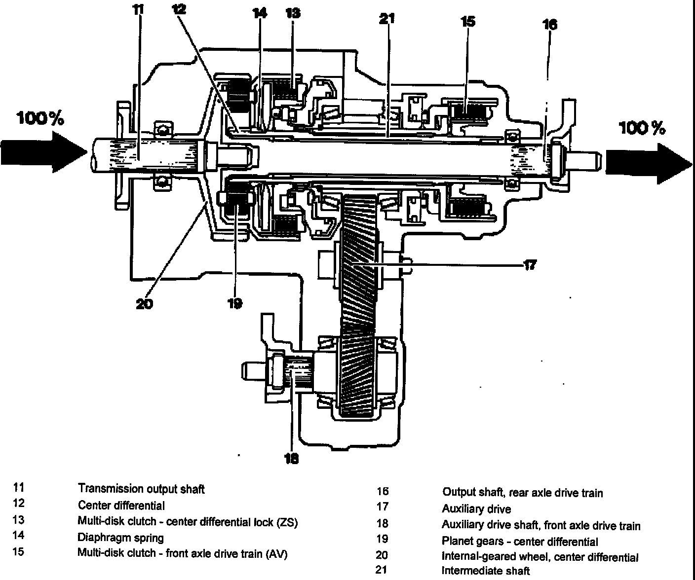 The multi-disk cJutch of the center differential lock (ZS) (13)is closed. In this way the planet carrier is connected to the sun gear and the differential is locked. The planet gears of the center differential (19) circulate without differential movement. The entire drive output i~ transmitted to the output shaft of the rear axle drive train (16), to which the planet carrier is rigidly connected.