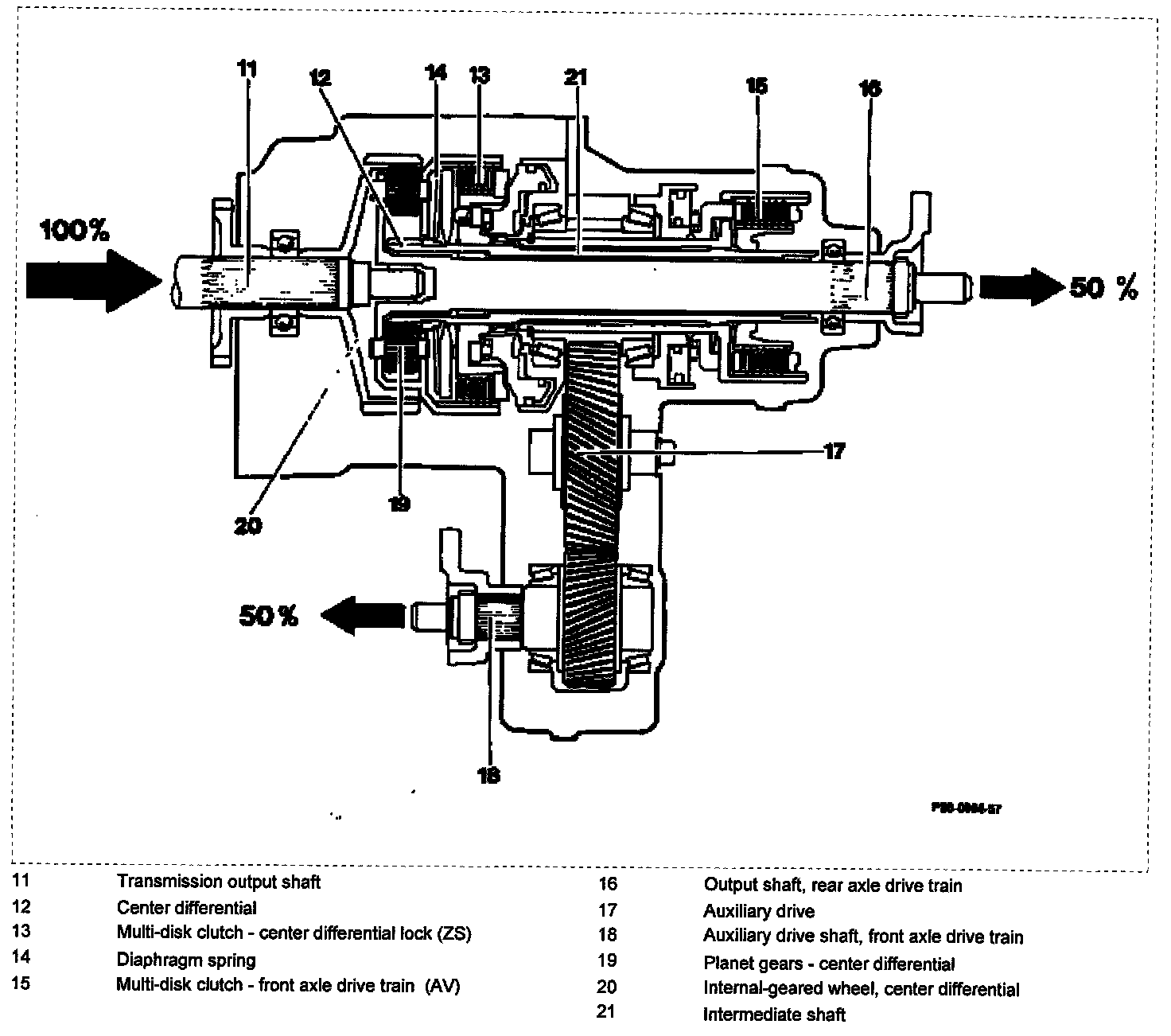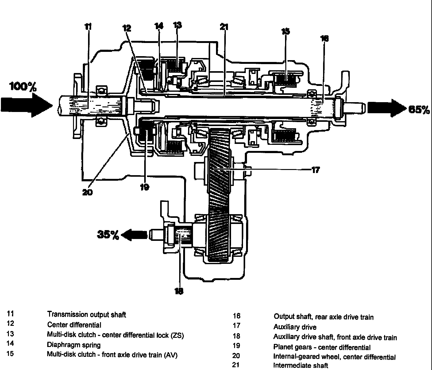 The drive moment is branched via the center differential (12). The ratio is selected so that in the case of compensated four-wheel drive, 65% of the drive output is transmitted to the rear-wheel drive and 35% to the front-wheel drive.