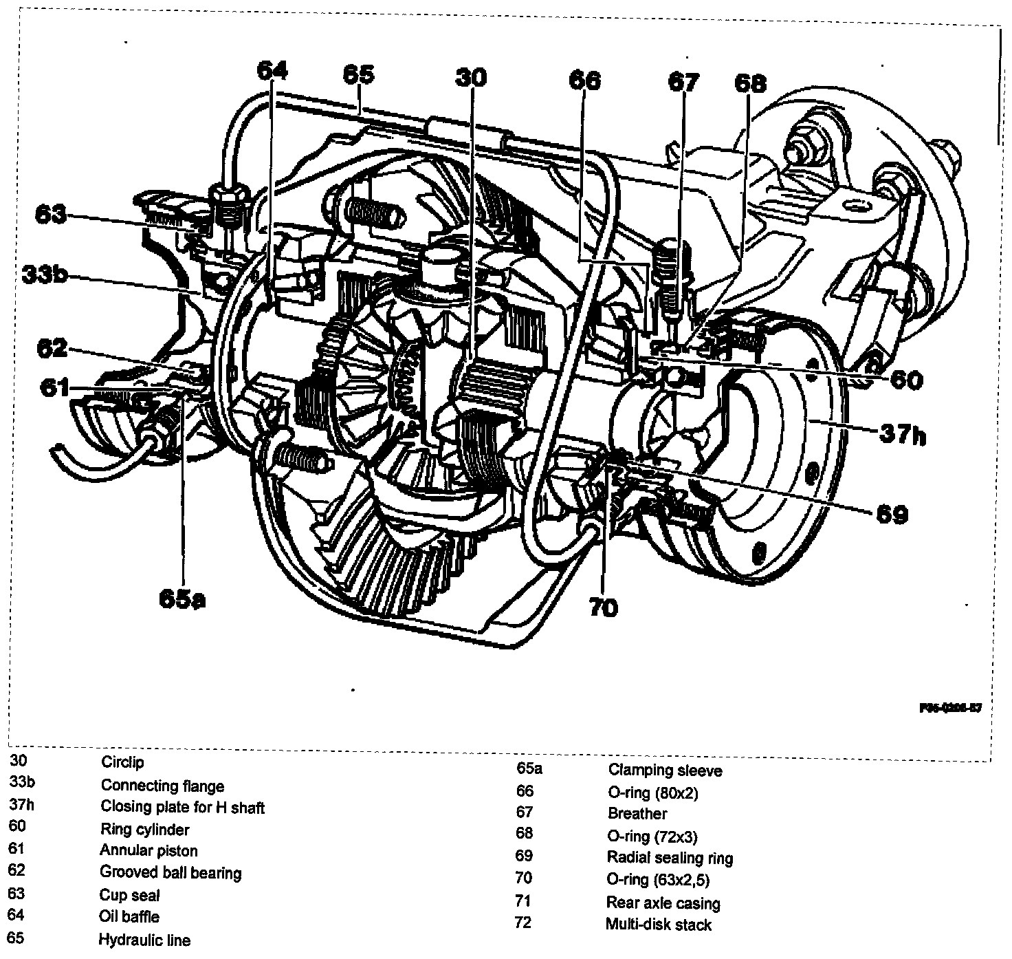 To ensure a reliable oil supply to the taper roller bearings of the differential and the connecting flange (33b) in the differential, an oil baffle (64) is installed on each side.
