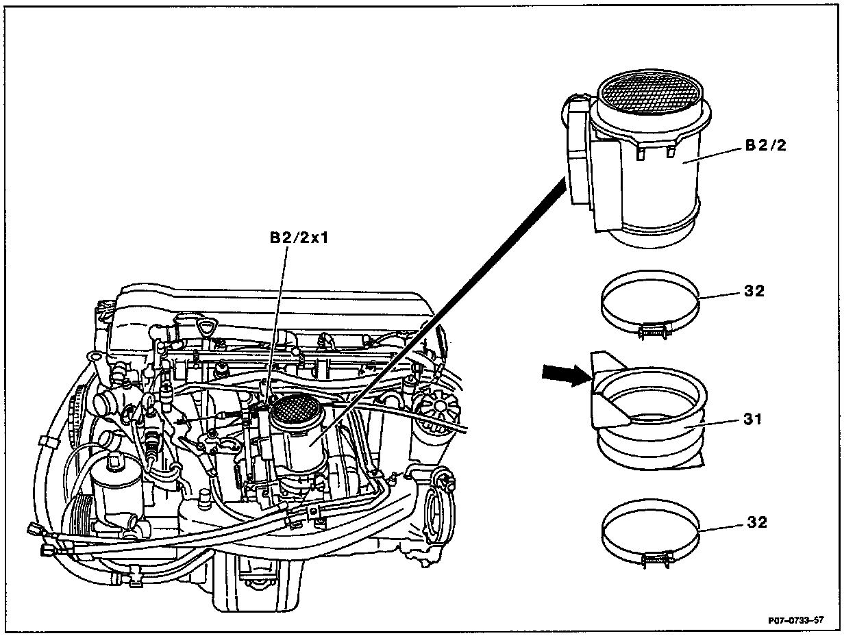 1. Detach plug connection (B2/2x1) at hot wire mass air flow sensor (B2/2).