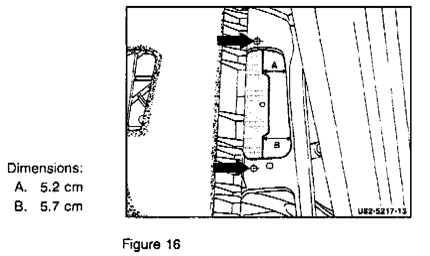 5. Punch and drill two 4.5 mm holes that will be in alignment with the phillips head screw holes just beneath cargo door ribs and located halfway between the screw holes and the opening (arrows, Fig. 16). Be certain that you drill through both the frame and the transmitter - receiver bracket. Remove clamp and bracket from opening. Remove any metal shavings and apply zinc dust paint to bare metal edges.