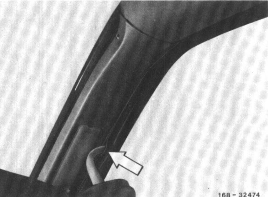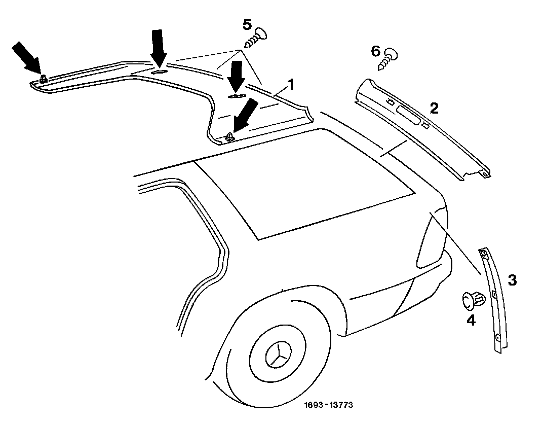 Pull trim (1) out of mount in roof frame toward the rear (rear arrows)