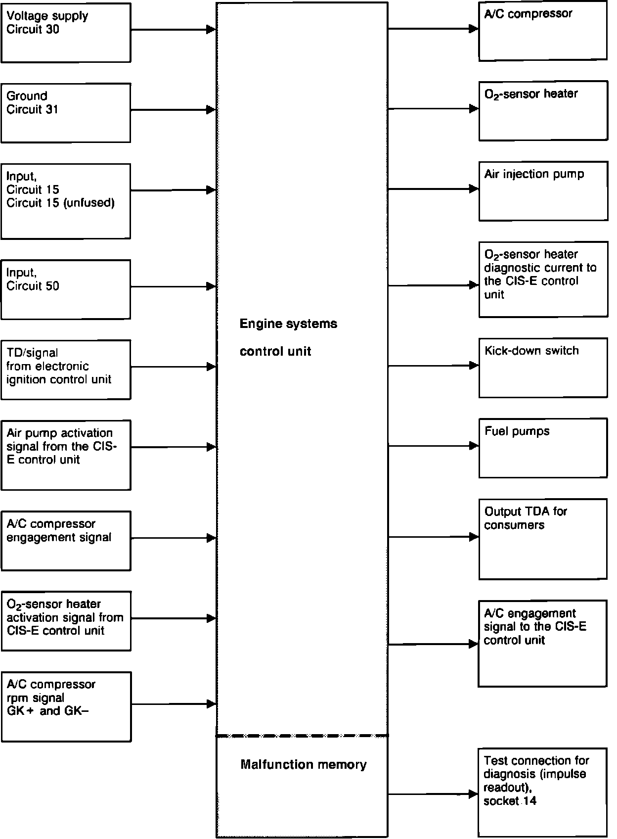 The MAS control unit is also equipped with on-board diagnostics. When the engine is running, any recognized faults will be stored in the control unit's memory. The stored faults can be extracted using an impulse counter at the on-board diagnostic connector. Furthermore, stored faults will not be erased if battery power is removed or the control unit is disconnected.