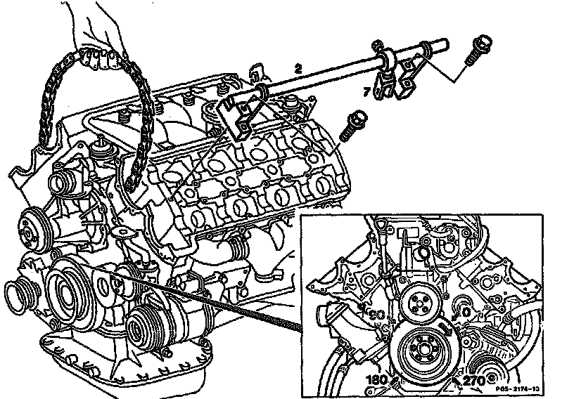 - Attach supporting bar, special tool 111 589 01 59 00 (2) with slide (7), off-center (facing toward outside of vehicle) to relevant cylinder head, take off.