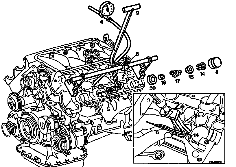 - Insert lever presser (9) with thrust piece (5), special tools 111 589 18 61 00 and 119 589 06 63 00, into slide (7).