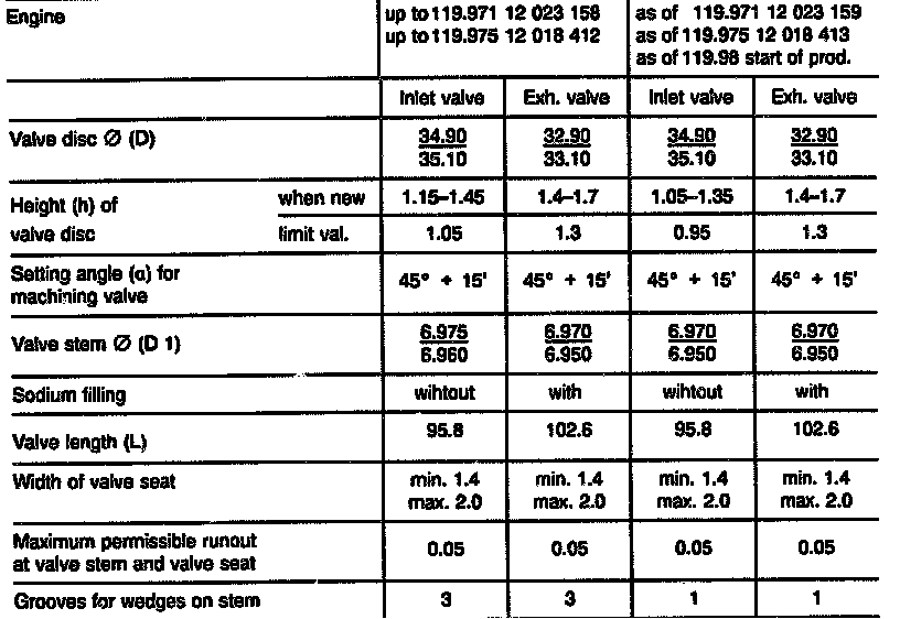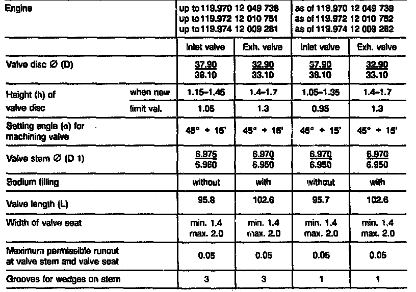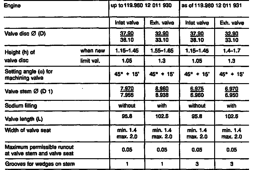 - The valve seats of valves as of model designation M119.98x must not be remachined; these should be replaced when performing repairs.