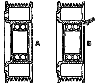 A spacer ring (arrow) has been installed in front of the bush in the belt pulley as a phased in measure as of 08/91; previously without spacer ring.