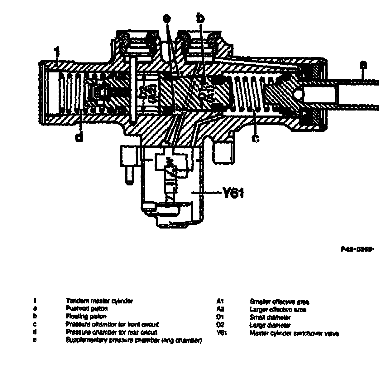 The basic design corresponds to that of a conventional master cylinder with pressure (a) and floating piston (b). The master cylinder switchover valve (Y61) enlarges the effective area (A1) of the floating piston (b) to the larger area (A2) to achieve a hydraulic pressure ratio of 1 to 1 between front and rear axles.