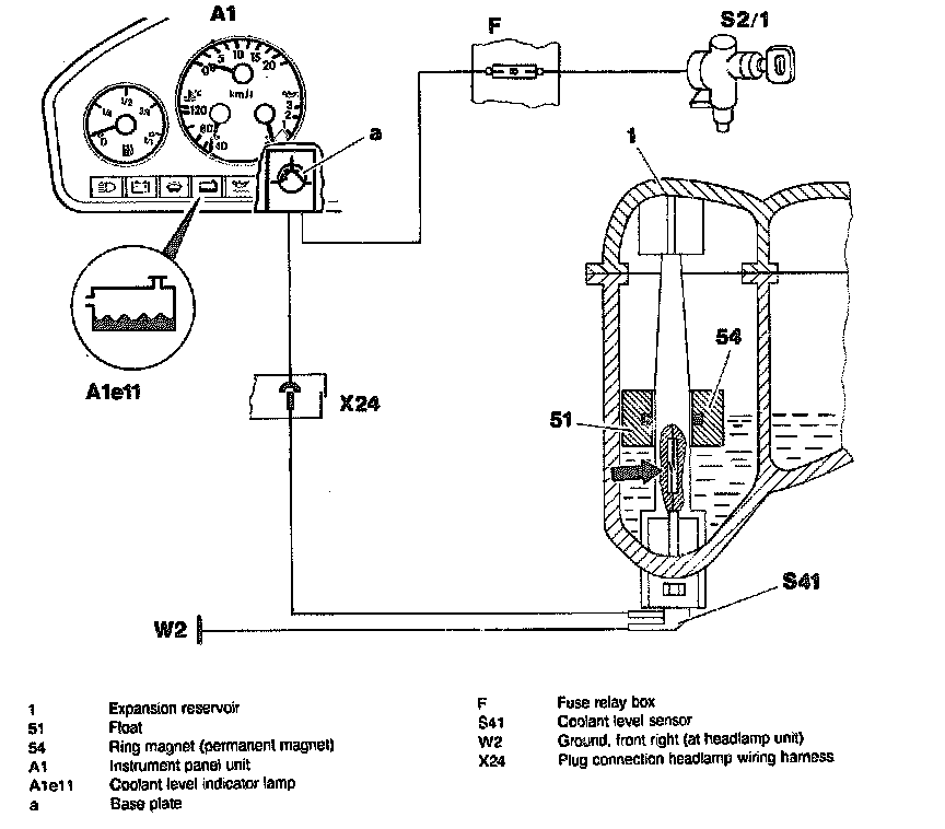 If the coolant level is too low the ring magnet (54) in the float (1) closes the contact (arrow) in the coolant level sensor (S41).