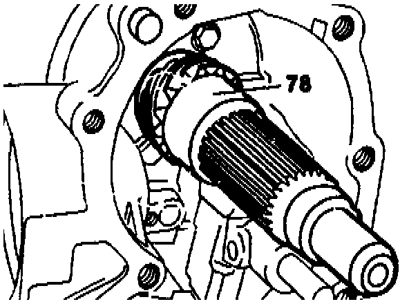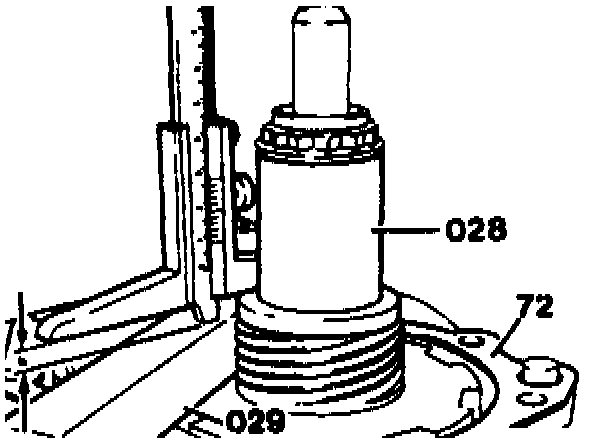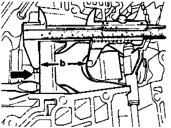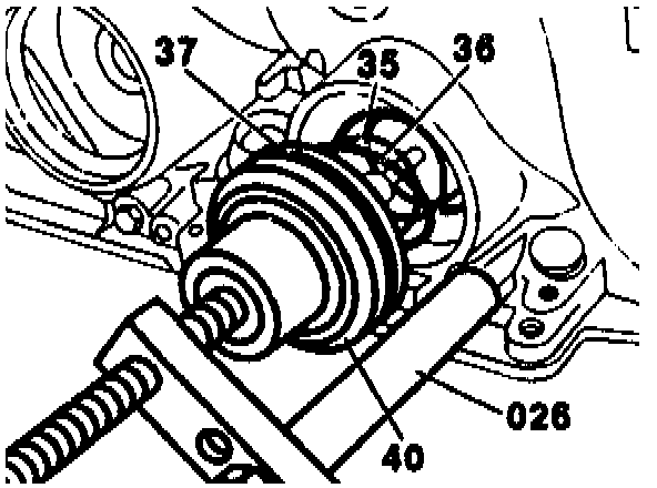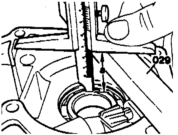 Place parallel-edged block (029) on the sealing surface of rear cover. Measure from parallel-edged block (029) to the inside ring Of the ball bearing using a depth gauge. Subtract 20 mm from the measured distance to obtain distance "a". Distance "a" minus distance "b" equals the axial play "C". Correct the axial play "C" to 0.4 + 01 mm by adding or removing shims (77) below the parking lock gear (73) (see figure to item 102).