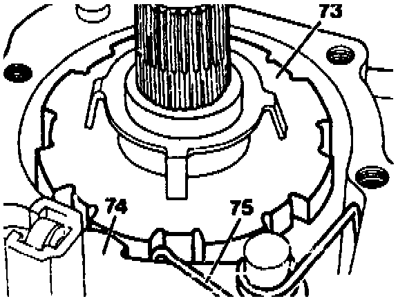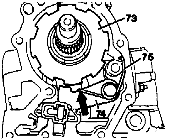 103. Push on parking lock pawl (74), insert expanding spring (75) and hook onto parking lock pawl (74).