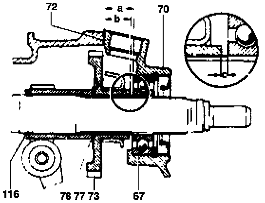 138. Check play "a" between locking plunger (122) and stop on spring linkage (B2), and adjust if necessary. The play "a" is adjusted to 0.4 - 1.0 mm in position "N" by means of the plastic dip (118). The plastic clip is available in two thicknesses.