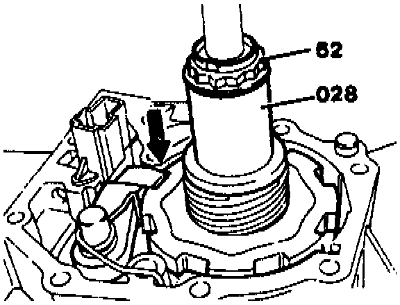 105. Measure axial play (C) of output shaft (clutch K2) and correct. Attach measuring sleeve (028) and tighten collared nut (82) to 100 Nm. Engage the parking lock pawl (arrow) to counter the nut. Attach seal (72). Position parallel-edged block (029). Measure depth from measuring sleeve (028) to block using depth gauge. Add 15 mm to the measured distance to obtain distance "b".