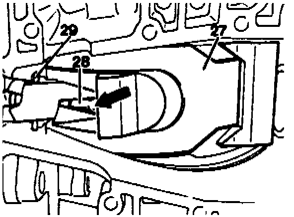 127. Measure clearance "L" at brake band B2 and adjust. Press brake band B2 (27) by the support tab towards the brake band plunger (in direction of arrow) so that brake band plunger rests against brake band plunger cover. Measure distance "a" at brake band using caliper gauge.