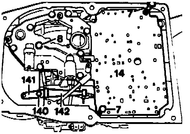 128. Insert brake band guide B2, one-way valve (49), filler element (128), locating pin (135), temperature restrictor (117) and oil deflector (119) in transmission housing.