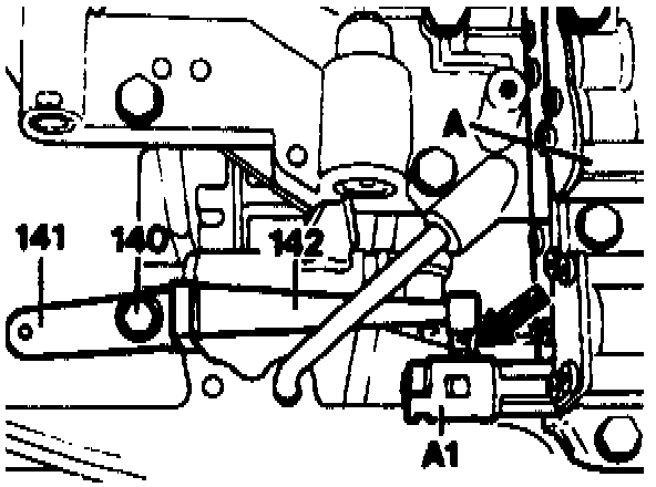 136. Attach shift valve housing (A), ensuring that the range selector lever (A1) engages in the driver on the notched plate (arrow).