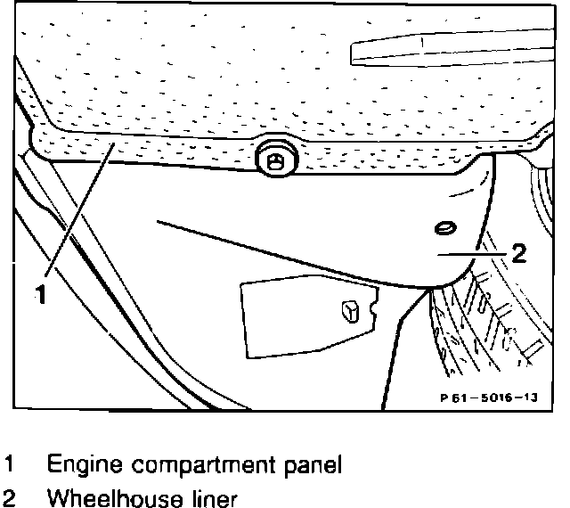 During the next maintenance requiring the removal of the lower engine compartment panel (1), make certain that you reinstall it in a such way that it will cover the left and right side wheelhouse liner (2) as illustrated. To do so, install the sheet metal clip nuts of the engine compartment panel on the wheelhouse liners .