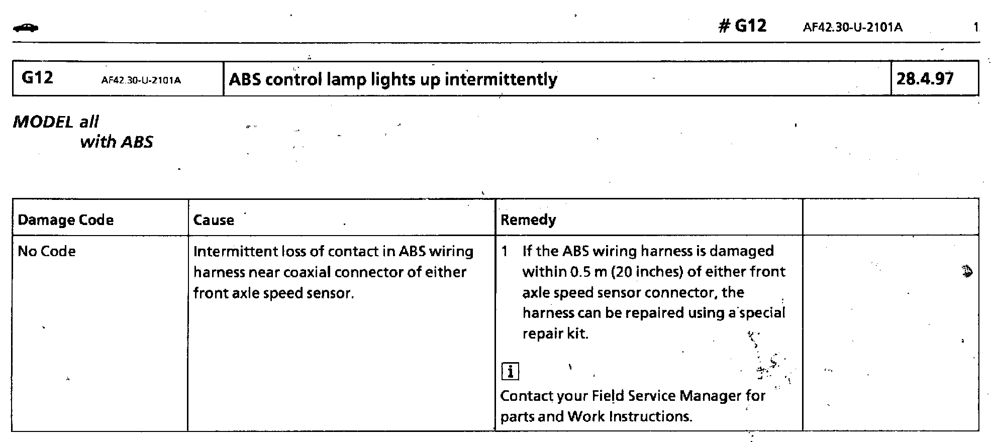 ABS Control Lamp Comes ON Intermittently