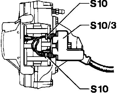 The brake calipers are malleable cast iron. The wear sensor connectors (S10/3 left and S10/4 right) bolt to cast-on fastener eyes. The pads differ from the normal version by recesses in the backing plate that serve to fasten the wear sensors. The brake pad size and type of material are identical with those on vehicles without ASR.