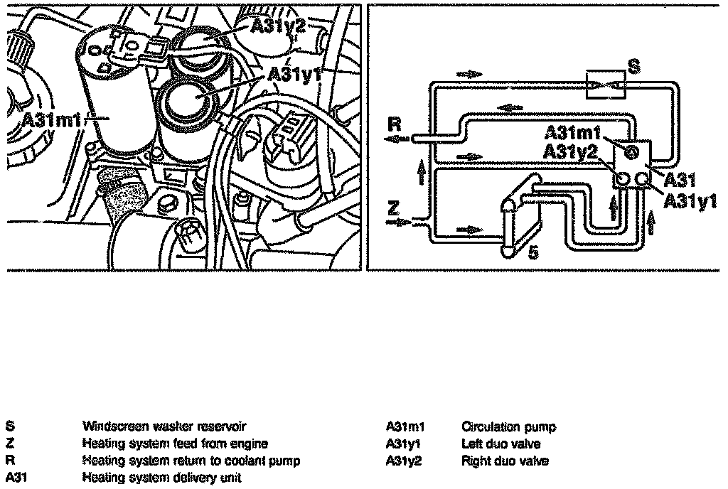 If the coolant temperature after switching off the engine is > 110° C, the coolant temperature is then monitored for a period of up to 1.5 minutes. If the coolant temperature rises above 110° C during this period as a result of being heated up by the engine, the heating water circulation pump (A31m1) starts the coolant circuit flowing in order to avoid local hot spots and the formation of vapor bubbles. The maximum period of this engine off cooling is 10 minutes. The engine off cooling program is ended prematurely if the coolant temperature drops to < 116° C.