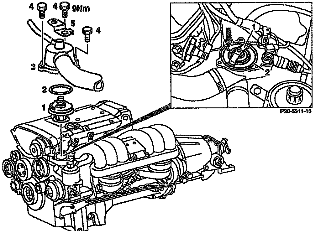 - Tighten coolant thermostat housing cover to 9 Nm