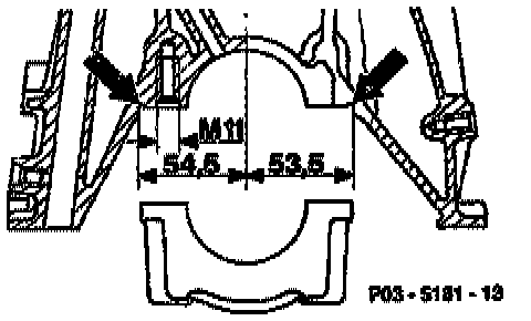 ^ The 7 crankshaft bearing caps are fitted at the side in the crankcase (arrows). The fit is off-centered so that the bearing caps can only be installed in one position.