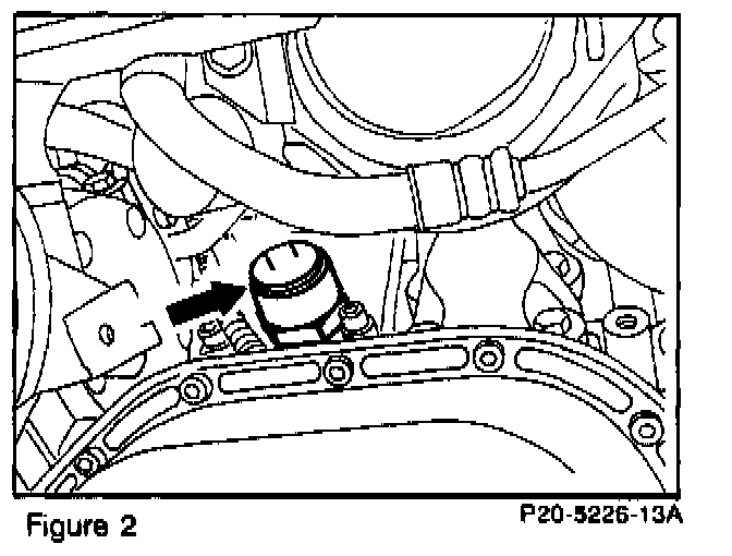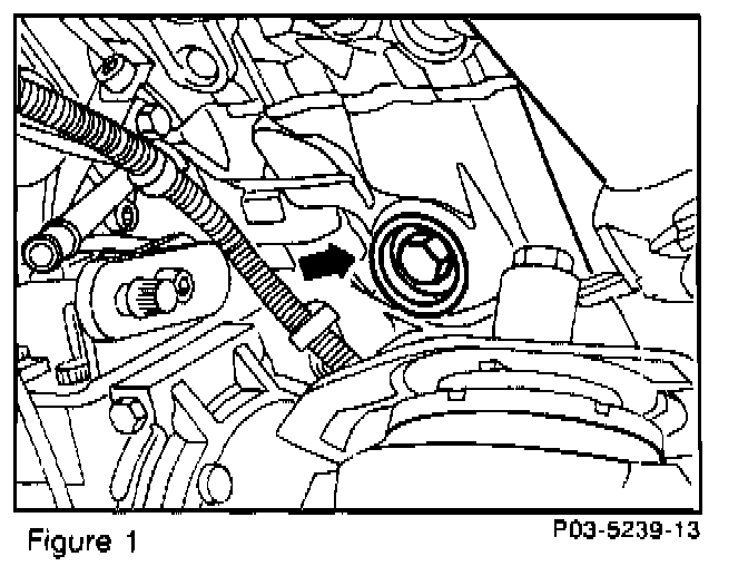 5. Remove core plug (arrow, Figure 1, [behind A/C compressor]) with a 22 mm 6-point socket insert.