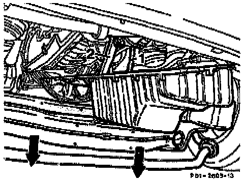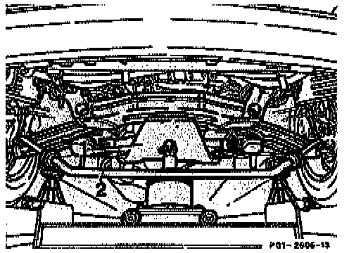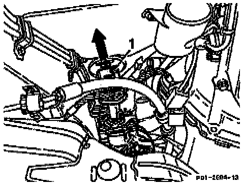 18. Unscrew bolt (1) of steering coupling, push steering spindle up (arrow).
