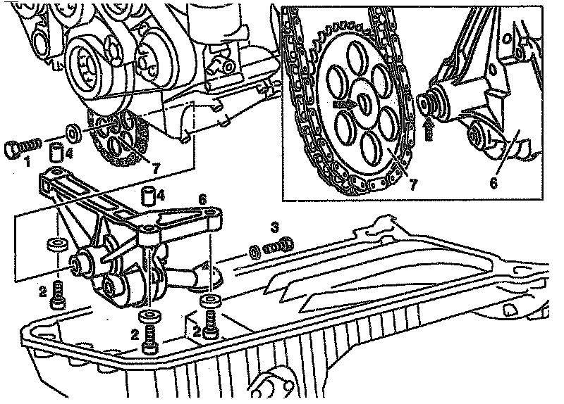 ^ Pay attention to position of tensioning bar relative to oil pump chain.