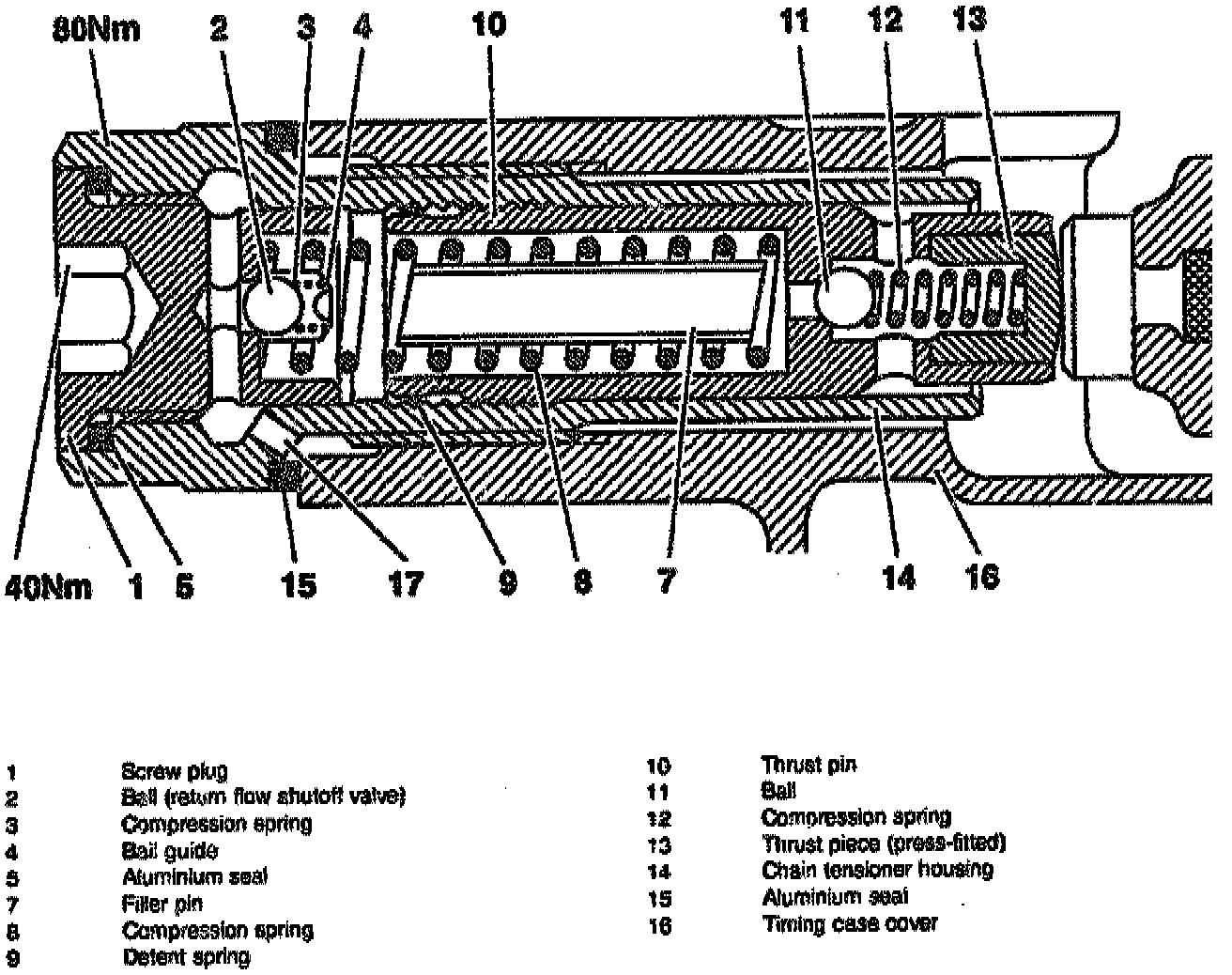 CAUTION: If the chain tensioner housing (14) has been slackened, it must be taken off as the thrust pin (10) is locked with the detent spring (9) in the pressure direction.
