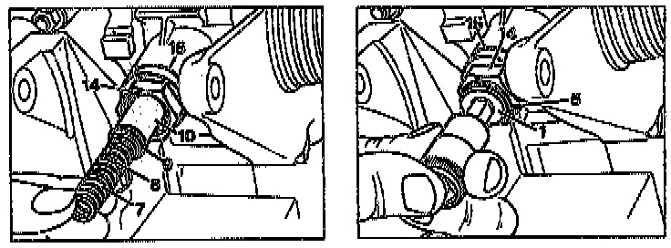 12. Press out thrust pin (10) with detent spring (9) in chain tensioner housing (14) in pressure direction.