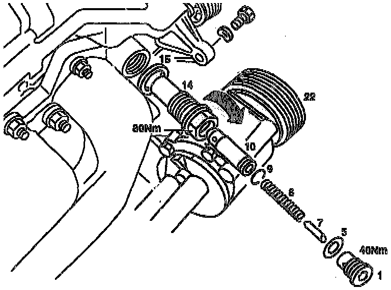 1. Install chain tensioner housing (14) with seal (15) and tighten to 80 Nm.