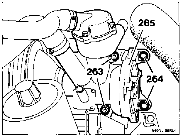 - Remove heating water return line (25) from coolant pump and place to the side.