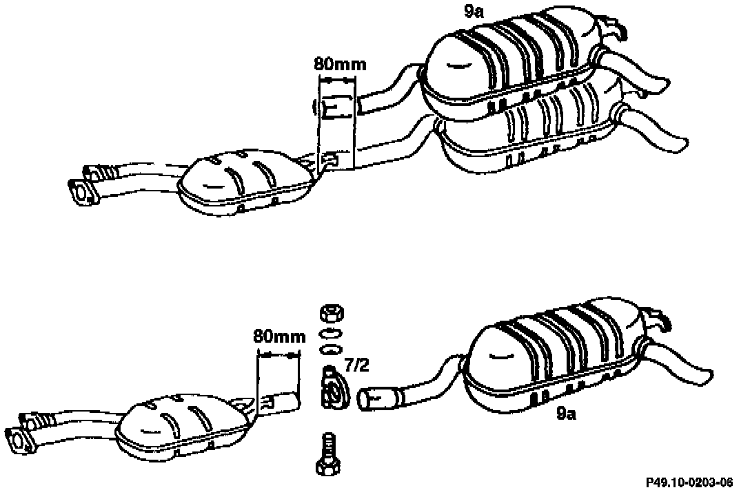 2. Place new rear muffler (9a) with plug connection exactly over the removed exhaust system and mark length of pipe of new rear muffler on the removed exhaust system.