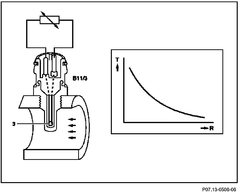 The NTC resistor (3) integrated in the coolant temperature sensor (B11/3) alters its electrical resistance in line with the coolant temperature. NTC means negative temperature coefficient, in other words the electrical resistance (R) becomes less as the temperature (T) rises.