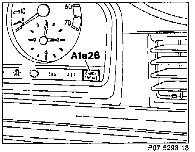 The CHECK ENGINE malfunction indicator lamp (A1e26) is supplied with voltage directly from the overvoltage protection relay module (K1/2) and is illuminated via a ground signal from the diagnostic module. As a functional check, the malfunction indicator lamp illuminates for a max. of 30 seconds when switching ON the ignition and up to an engine speed of approx. 500 rpm. If there are no malfunctions, the diagnostic module opens the ground signal to the lamp and the lamp goes out.