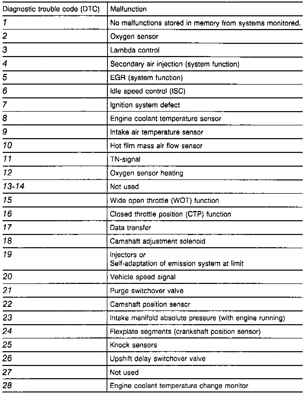 The diagnostic module is equipped with DTC memory that stores DTC's from monitored systems. The memory is cleared once the vehicle's battery is disconnected. With the ignition switched ON, data transmitted over CAN is received by the diagnostic module. If a malfunction should occur while driving, e.g. in the fuel injection system, the engine control module switches to a fixed operating mode, notes the malfunction and "notifies" the diagnostic module.