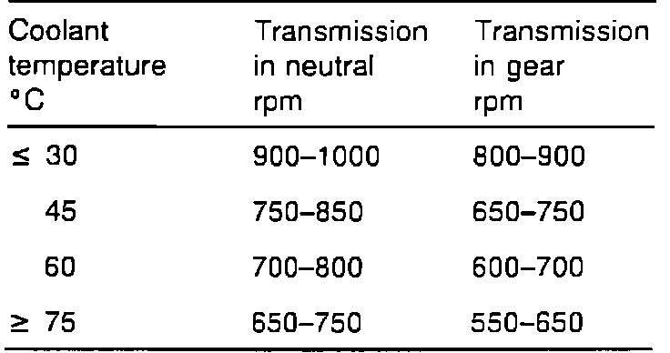The warm-up control is effective at all engine temperatures. After each start-up (accelerator pedal in idle position) the engine increases the idle speed for approx 20 seconds. Below 20 °C (68 °F) the engine speed is 900 - 1000 RPM.