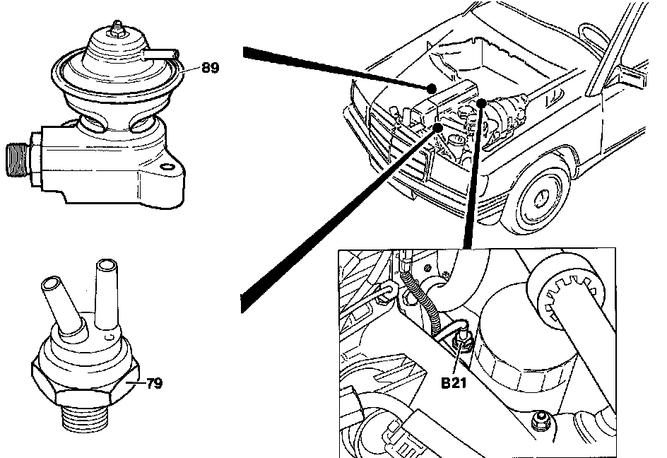 Exhaust Gas Recirculation System (EGR)79 Thermovalve, opens at + 7O° C, closes at +60° C.