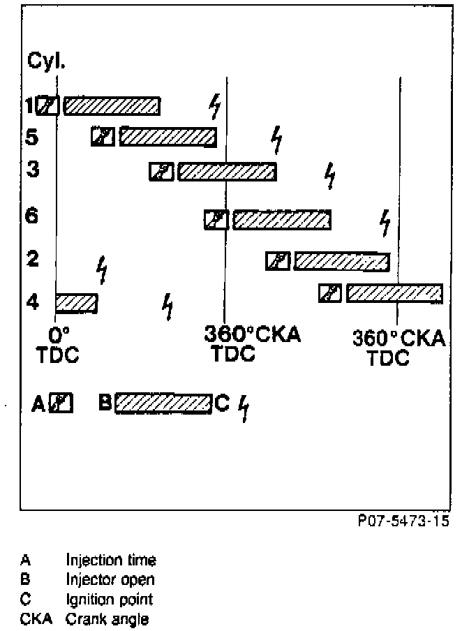 To properly coordinate the fuel injection timing for each cylinder, the injection sequence must be synchronized. Synchronization occurs during cranking. The camshaft position sensor (L5/1) signal is used to determine ignition TDC of cylinder 1.