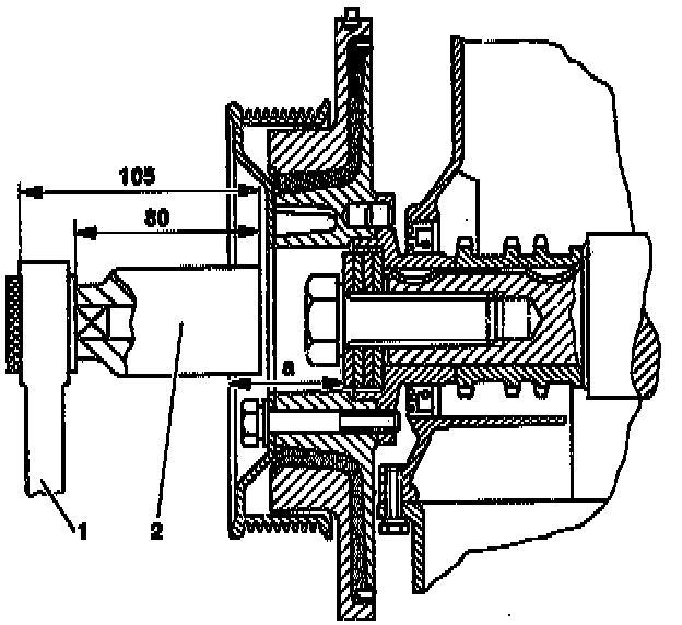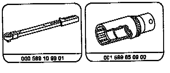 4. Rotate crankshaft with torque wrench (1) and wrench socket (2) 001 589 65 09 00 WAF 27 in direction of rotation of engine.
