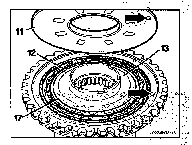 11. Lift internally-toothed disc carrier K2 (19) with freewheel out of connection carrier (7).