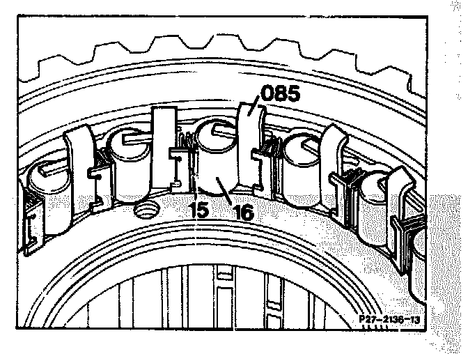 15. Press cylinder rollers (16) against pressure springs (15) and insert retaining plates (085) with offset end facing outwards.